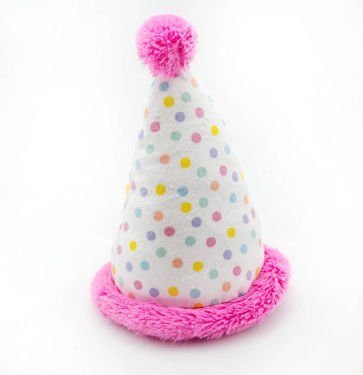 Top off your pup's birthday celebration with our Birthday Hat Pink Plush Dog Toy! This charming 7” toy brings the party to your furry friend with its festive pink hat design. Perfect for small to medium breeds, this plush party hat is more than just a cute accessory - it's a fun-filled toy that will keep your dog entertained long after the birthday candles are blown out. The built-in squeaker provides an exciting sound that will have your pup coming back for more fun. Durably constructed to withstand enthusiastic play yet soft enough for cuddles this birthday hat toy is versatile enough for any play style. Whether it's a game of birthday fetch, an iconic photo shoot or just a cozy companion for opening presents, this toy is sure to make your dog feel extra special on their big day. Made from pet-safe materials you can relax and enjoy the celebration knowing your furry friend is playing safely. Let the party begin!