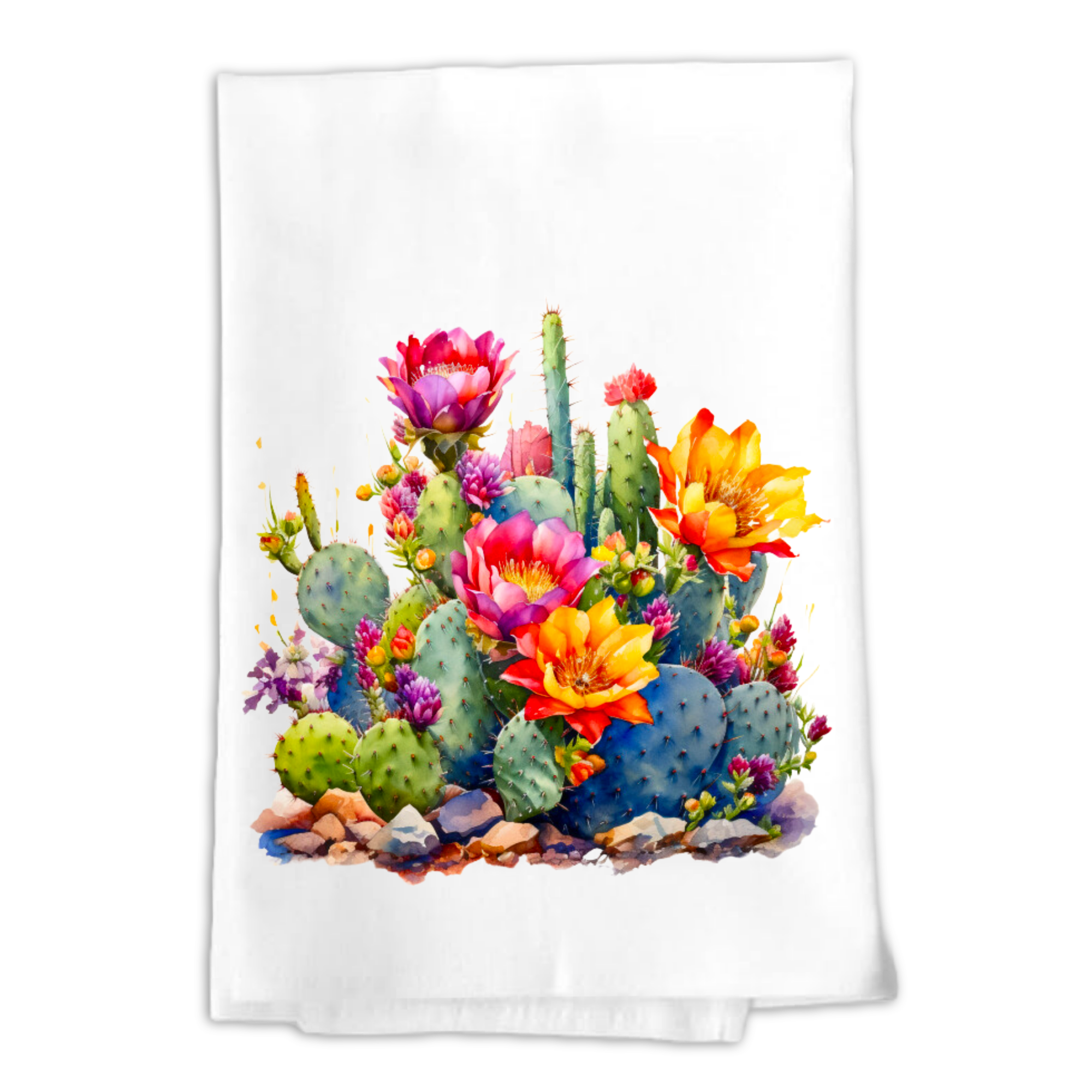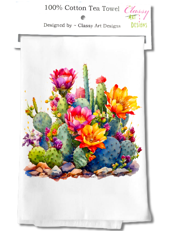 Cactus Flowers tea towels are 100% cotton flour sack tea towels that come with a sturdy header for easy display hanging and a hanging hook on the back for drying. Cactus Flowers tea towels make great gifts and souvenirs nature lovers.
