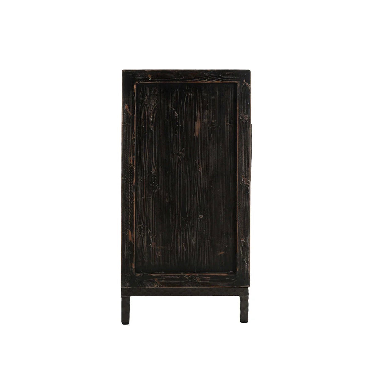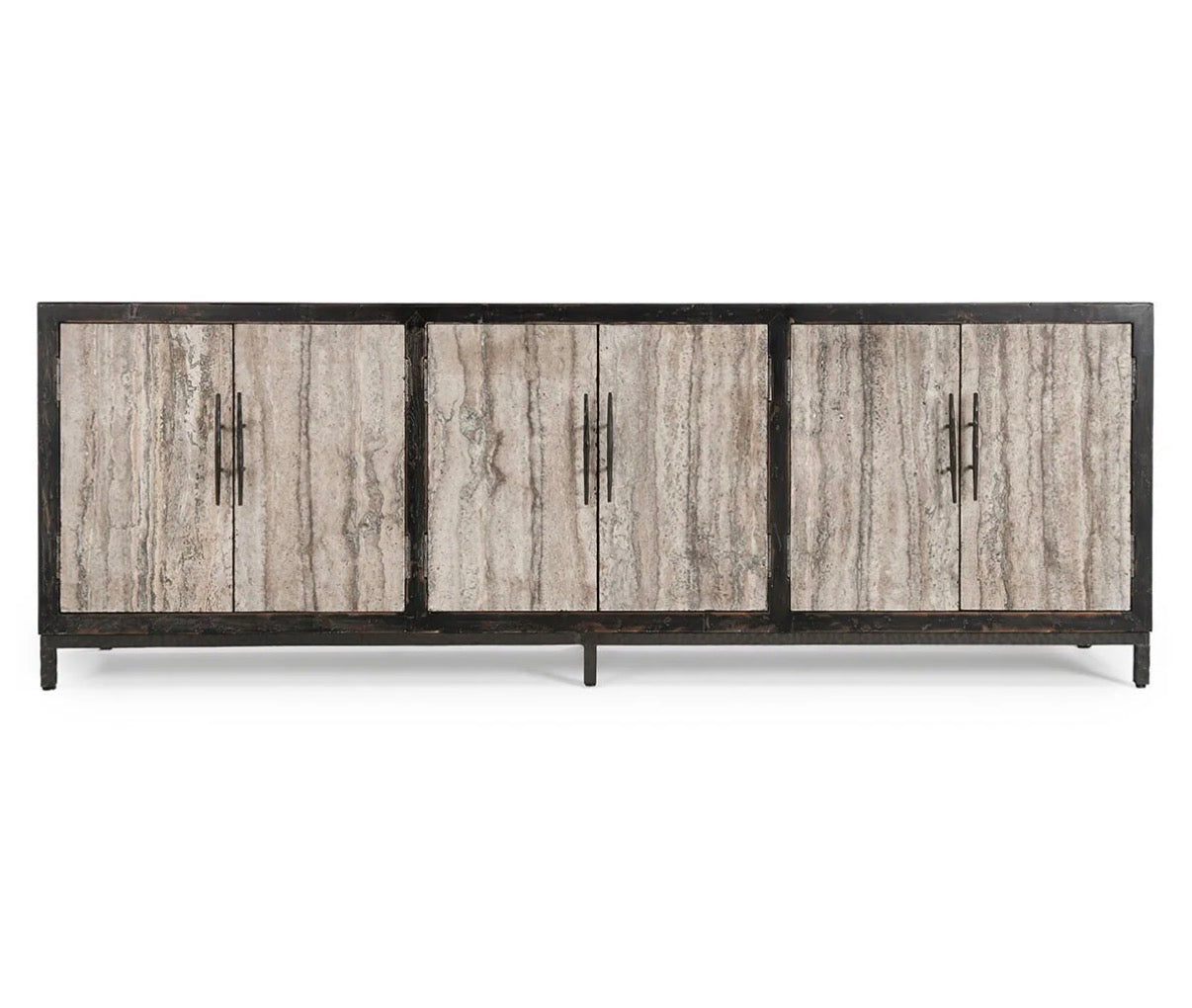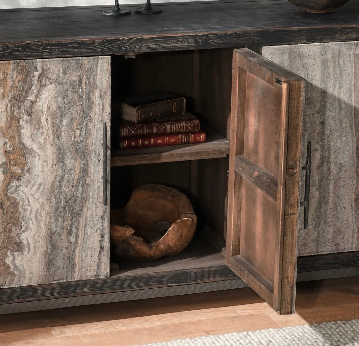 Smooth Travertine doors contrast against the reclaimed pine wood frame of this handsome sideboard.