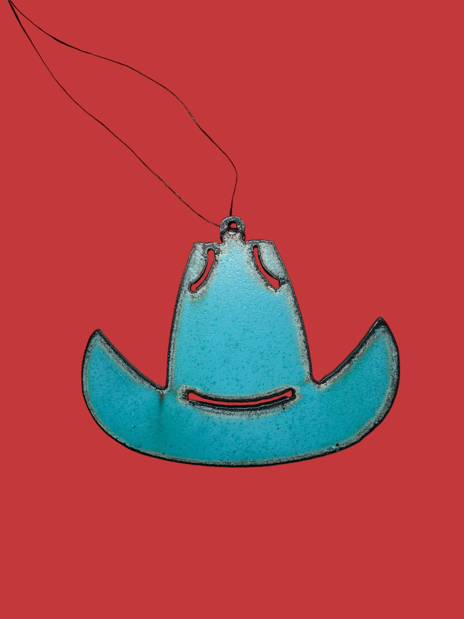 We love our simple cowboy Hat Ornament. They are painted VINTAGE TURQUOISE on front and clear coated rust on back. Made with strong metal that is recycled from sourced goods all over the United States.