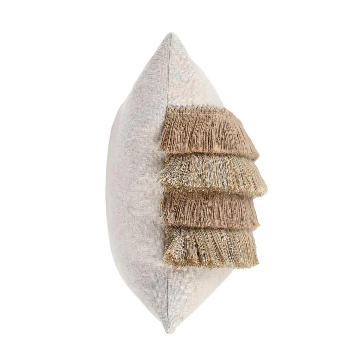 Crafted using natural elements and materials, the applique of jute blended fringe to create this design makes for a fun statement style. A soft feather and down blend insert gives this pillow a lavish supportive feel that makes this pillow as comfortable as it is beautiful.