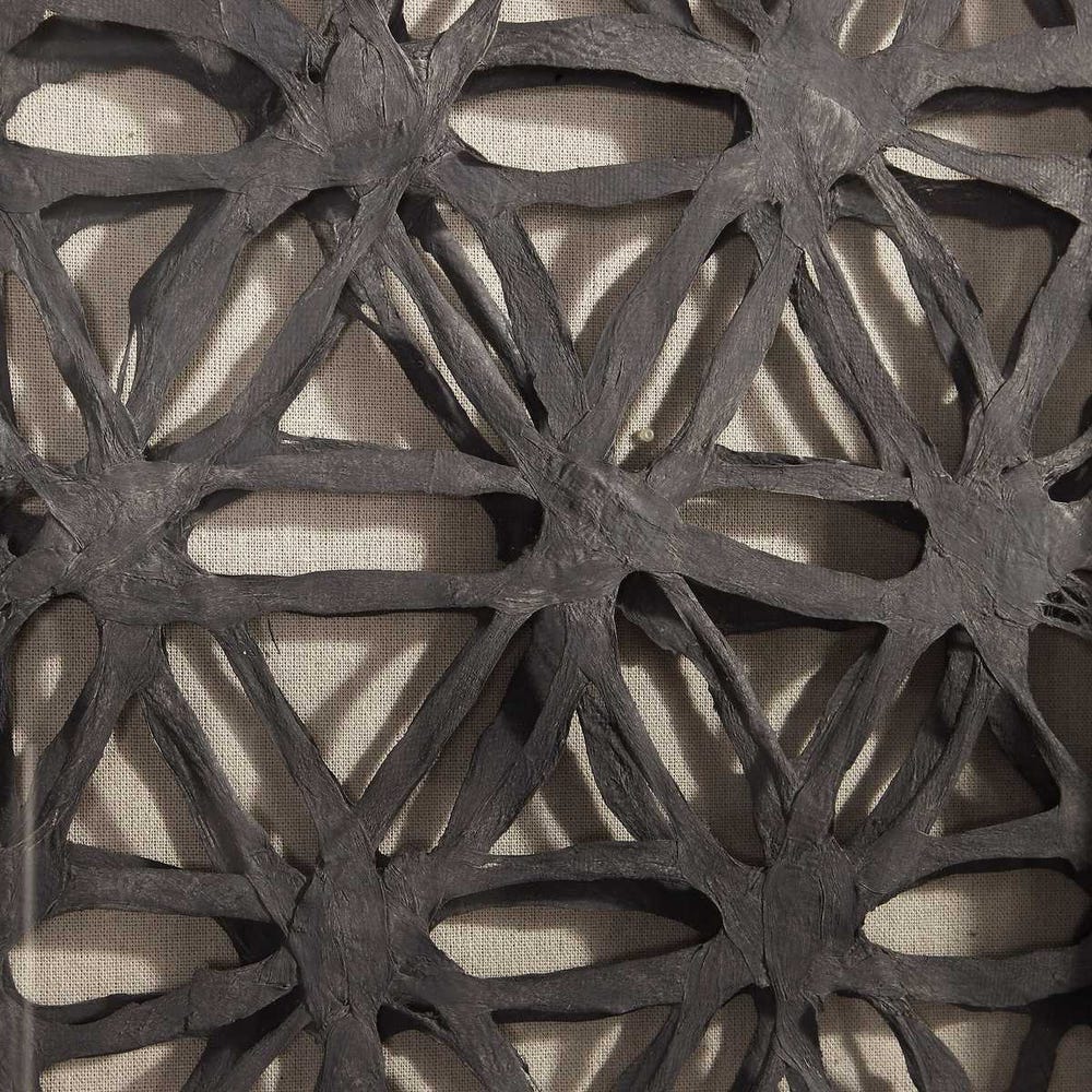 Elevated 3-dimensional layers of geometric hand torn paper in charcoal black placed atop a natural linen fabric background, showcased in shadow box pine wood frames finished in aged black. Artwork is under glass. May be hung horizontal or vertical.