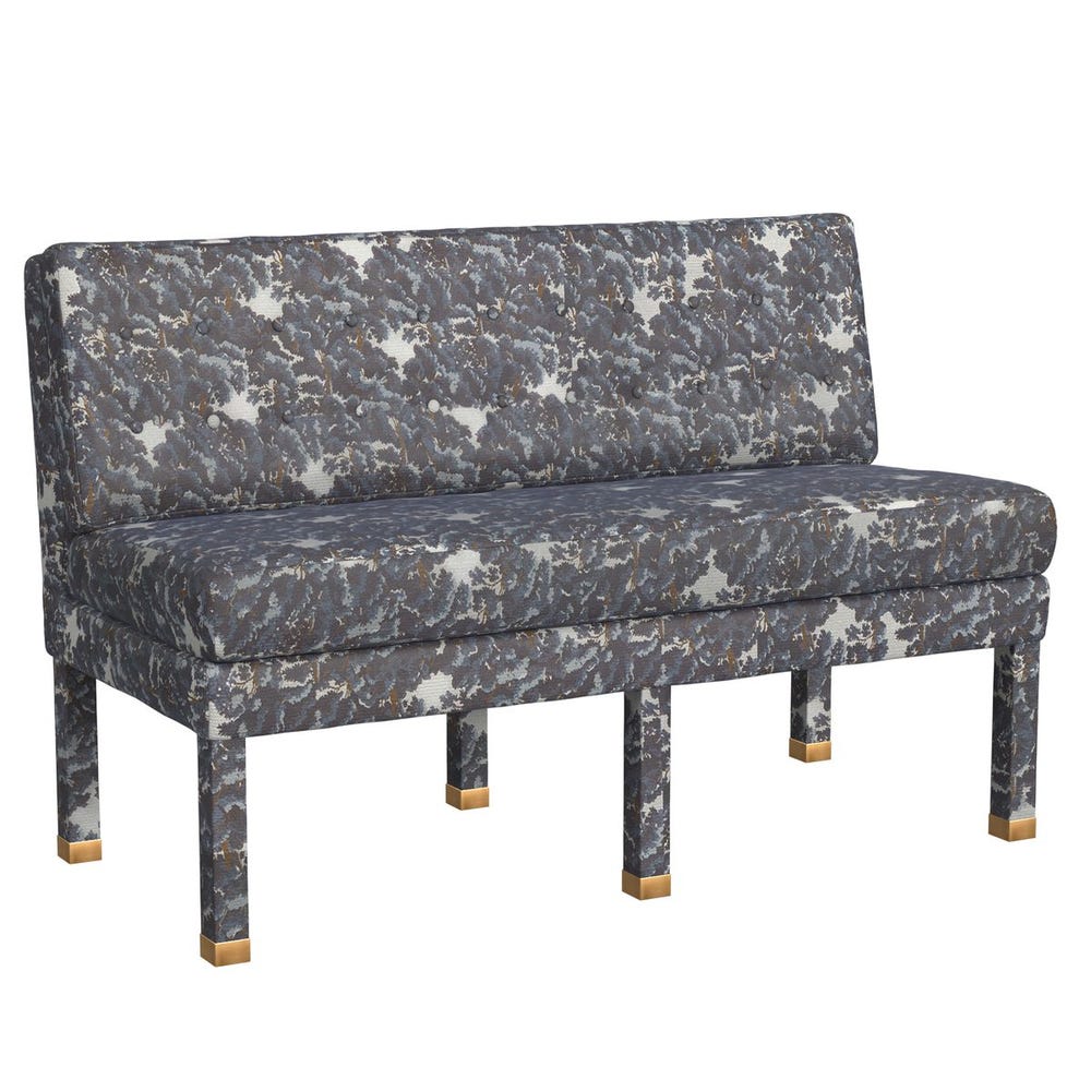 The 84" banquette features a fully-upholstered hardwood frame with one attached bench cushion and an attached biscuit-tufted back cushion. The six legs are finished with brass sabots. The solid hardwood frame is wrapped with 100% cotton and includes webbing seat support. The seat cushion contains 24/45 high-resiliency foam core for supportive and long-lasting comfort. Fully upholstered in a jacquard weave inspired by Flemish tapestries, updated in shades of blue on a seafoam ground, accented with chocolate brown. The Crypton fabric is stain-free, anti-microbial, anti-bacterial, mildew- and odor-resistant. Made in the furniture capital, High Point, NC. This is a custom order item and can not under any circumstances be canceled or returned for customer remorse.