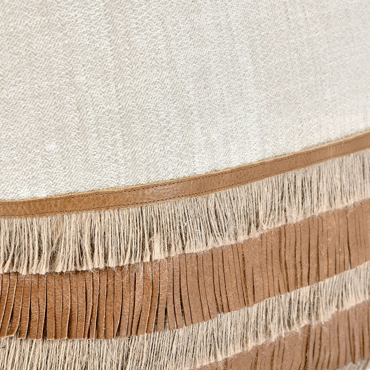 This pillow features alternating layers of jute and leather fringe that create a unique striped design. Delicate hand embroidery detailing adds another subtle layer of texture atop the solid cotton base.