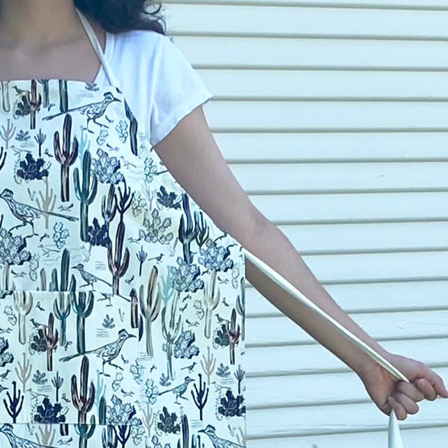 Made with sturdy 100% cotton, ready for cooking, this easy-to-adjust drawstring artist-designed southwestern favorite has a dual pocket front and an information tag to show various ways of tying off the incredibly versatile apron. The roadrunner pattern is an absolute best-seller as a linen tea and is now offered as an apron and matching oven mitt. Create a whole southwestern lovers kitchen package.