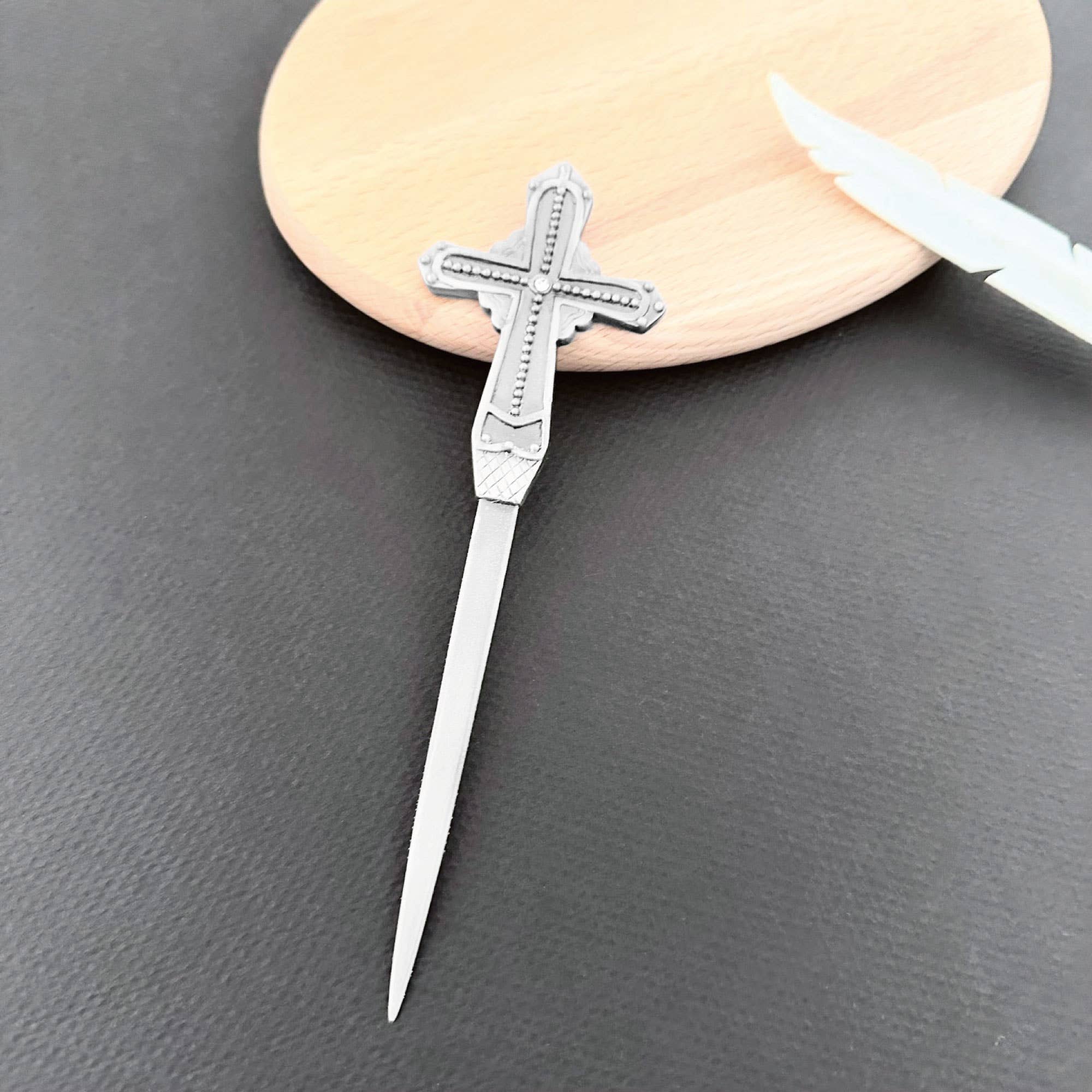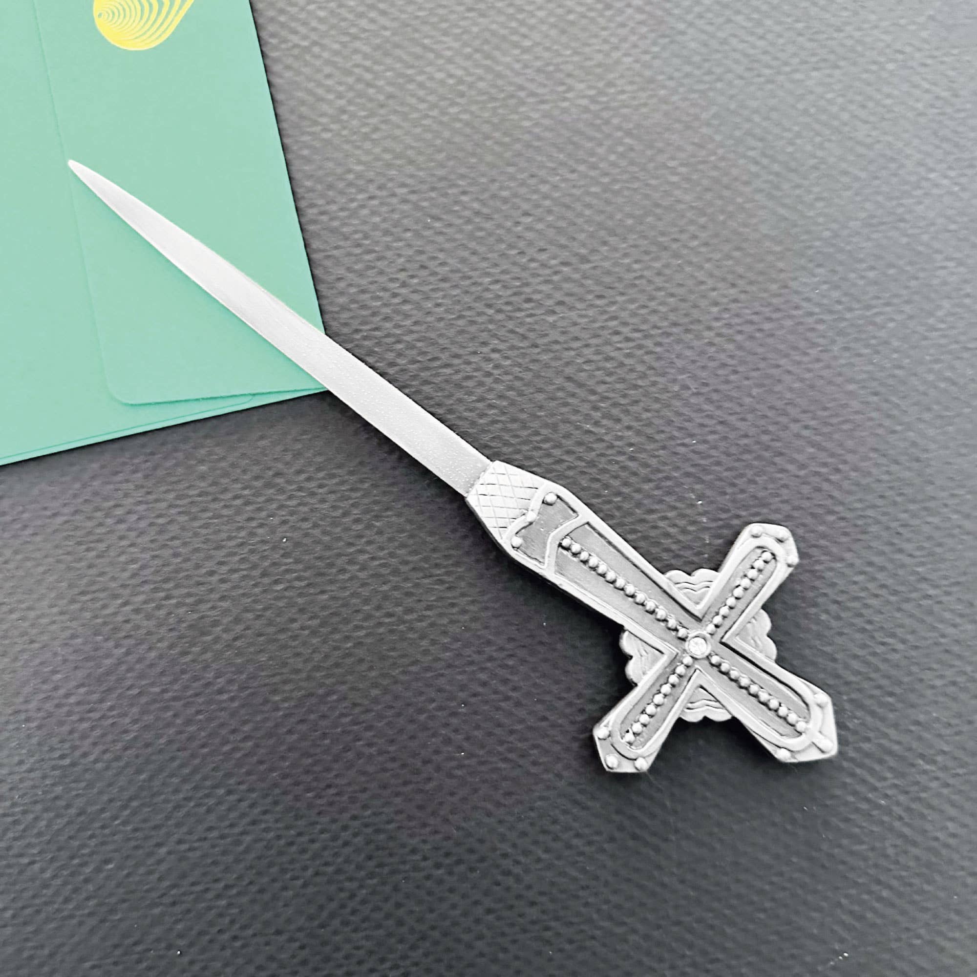 The handle of this letter opener features a cross-shaped design, symbolizing elegance and sophistication. Made from high-quality pewter, this letter opener is durable and built to last, ensuring years of reliable use. This letter opener effortlessly opens envelopes with precision and ease.