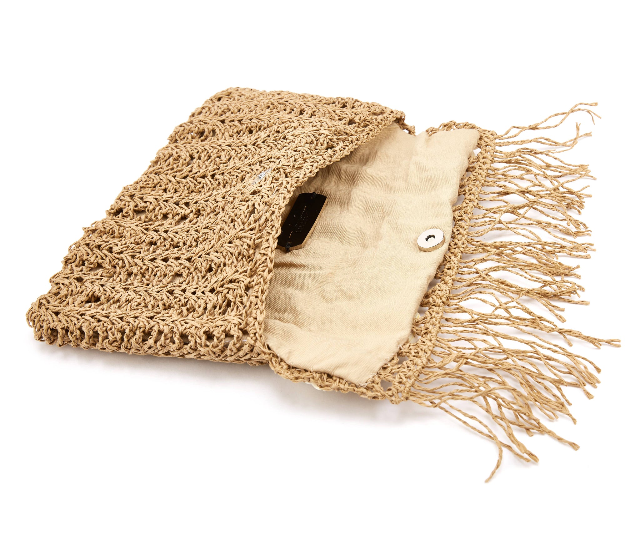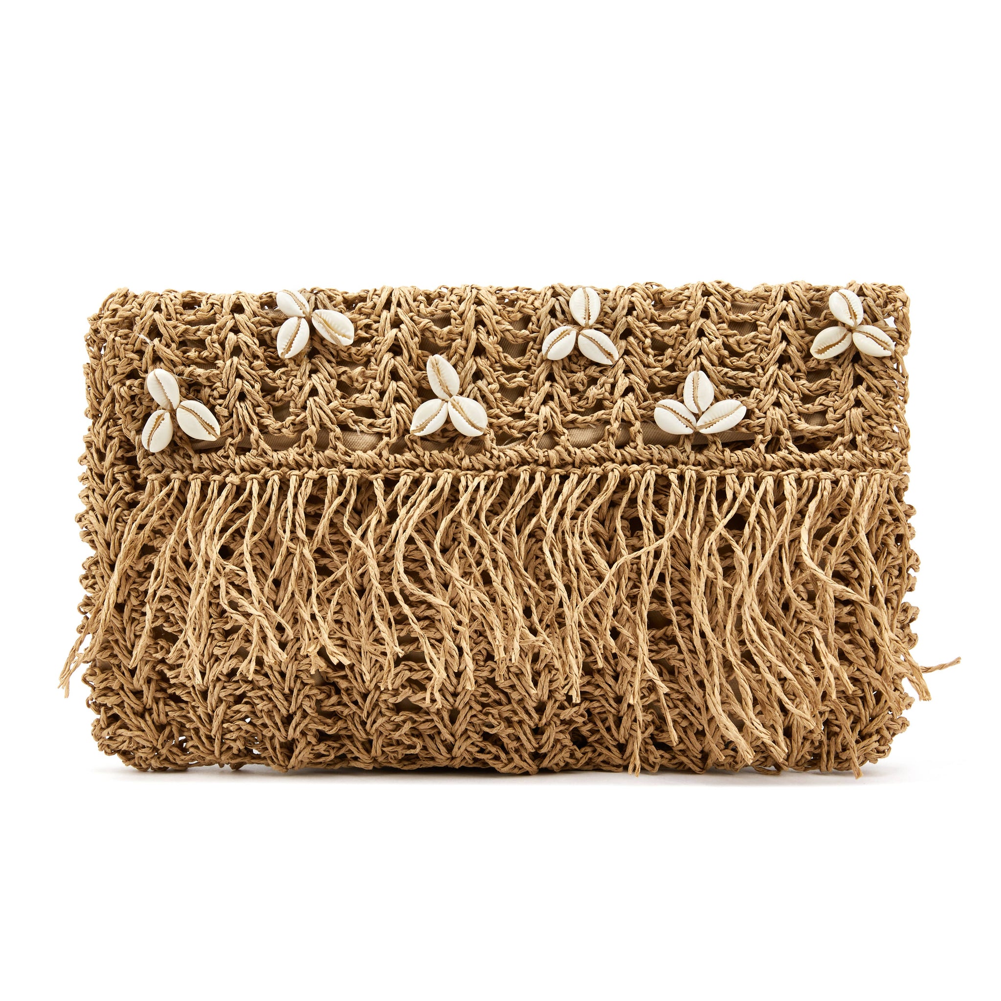 This hand-woven clutch is designed with beach holidays in mind. It's made from paper rope, has a softly structured silhouette topped with natural seashells. It's sized to fit your phone, keys and wallet. - 100% paper rope and 100% linen lining - Magnetic-fastening top - Height: 6"/16cm - Width: 10"/25cm - Comes with a dust bag - Handmade in Turkey