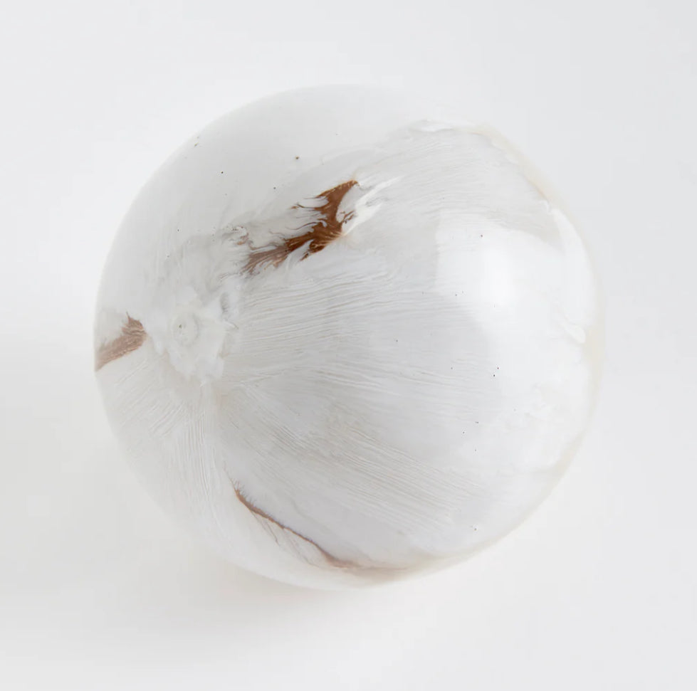 In a clever use of enameled iron, this lightweight orb is painted by hand. With a creamy mocha palette inspired by a latte, with layers of milky froth and coffee tones swirling, it is simple artistry defined.