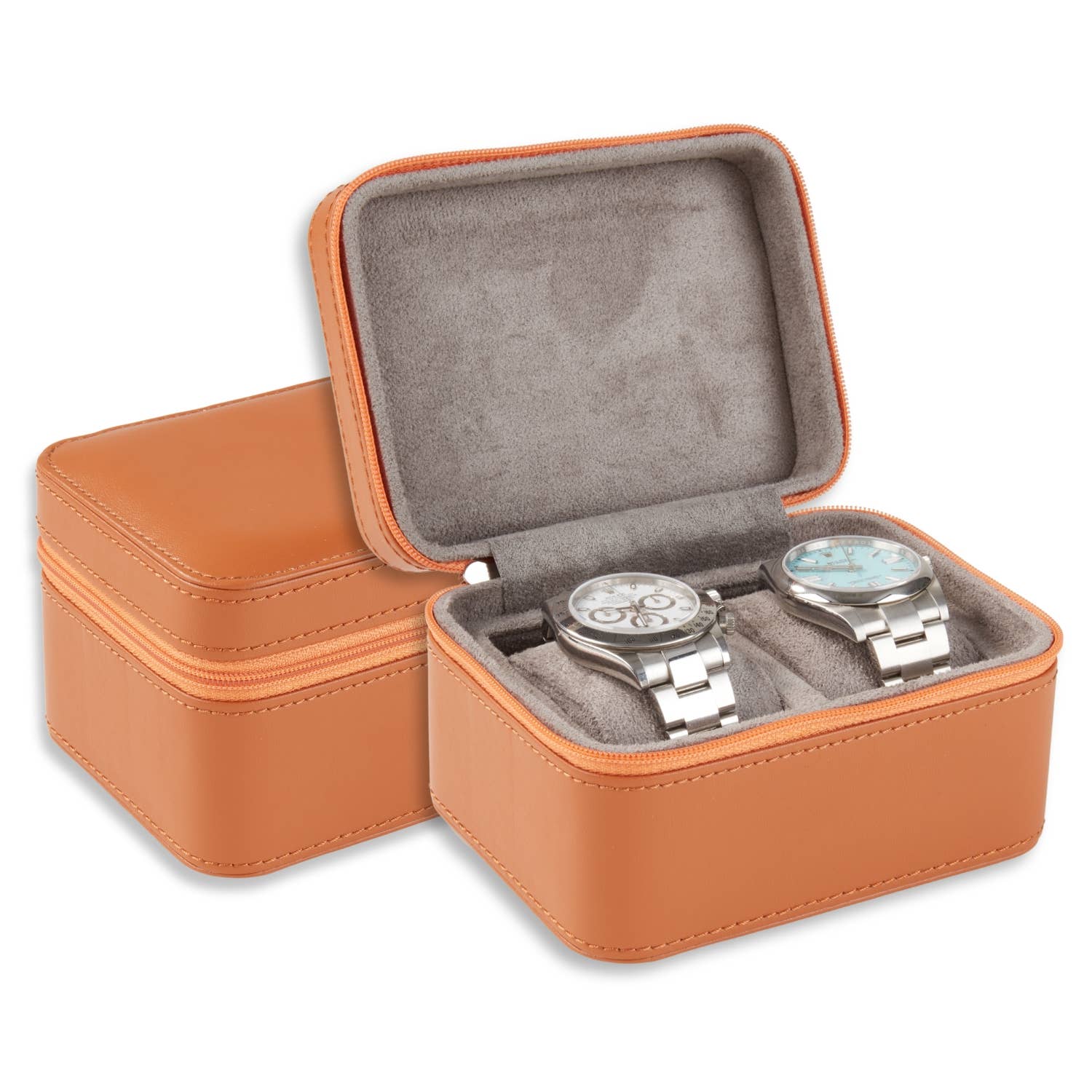 Meticulously crafted from high-quality genuine leather, this sleek and sophisticated watch case exudes luxury and durability. The sleek exterior not only offers a timeless aesthetic but also ensures your watches remain safeguarded from scratches, dust, and other potential damage. With a thoughtfully designed interior, featuring two compartments with soft lining, each watch is cradled securely, preventing any unwanted movement or friction, with a zipper closure adding an extra layer of security.