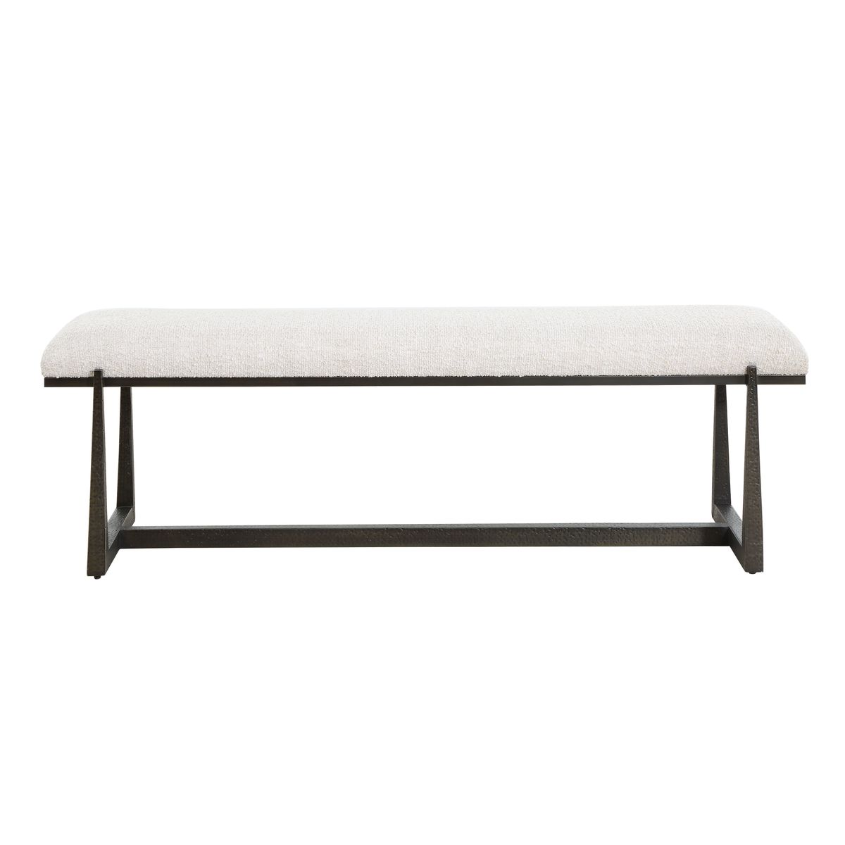 This elegant bench adds a touch of luxury to any room. Its textured black iron legs perfectly support and accentuate the upholstered top, covered in a textured bone white boucle.