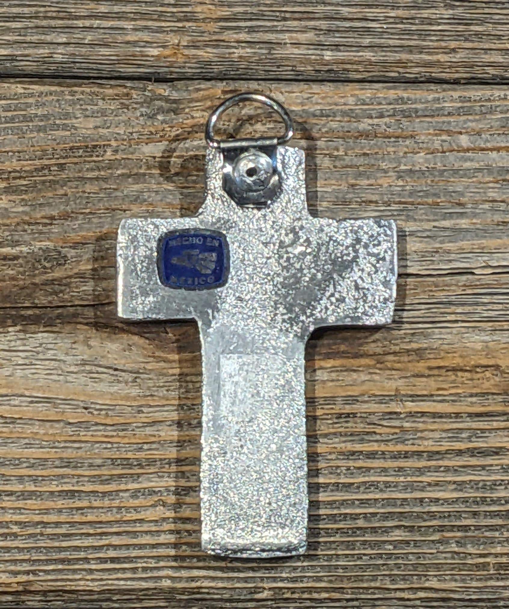 Mini pewter vine cross, hook for hanging. Mexico