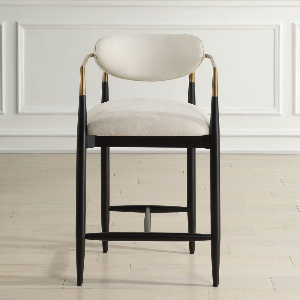 The sleek wraparound frame of the Moxie counter stool exudes style and sophistication. The tapered solid wood frame is finished in matte black and accented by metal arms in plated brushed brass. Its plush seat and back is upholstered in a finely textured off white, low pile velvet.