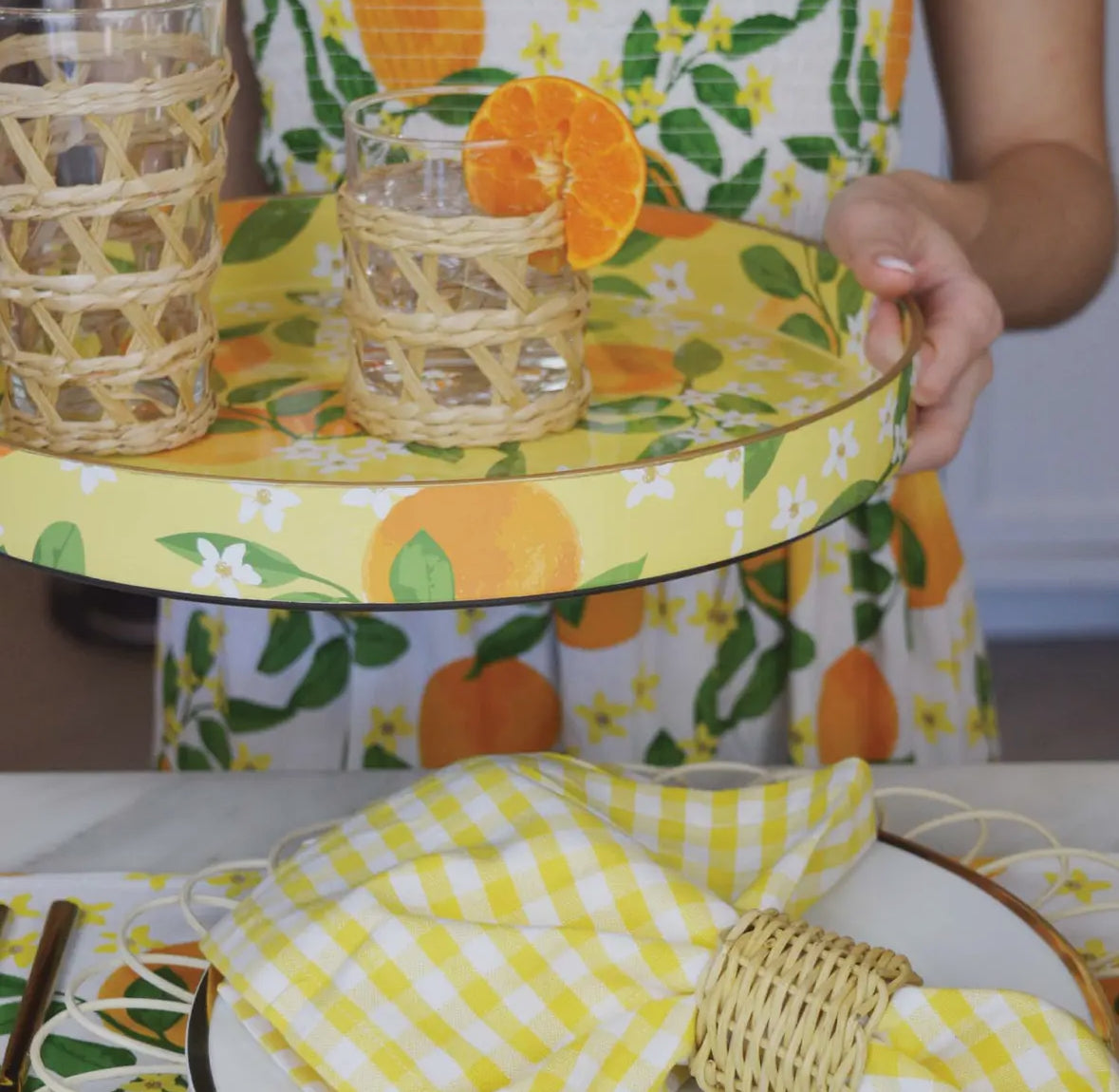 Pair this item with our matching table linens and natural rattan decor for an elegant setup that will add sophistication to each gathering! Add the Orange Grove Round Tray to your home and start hosting like a pro!