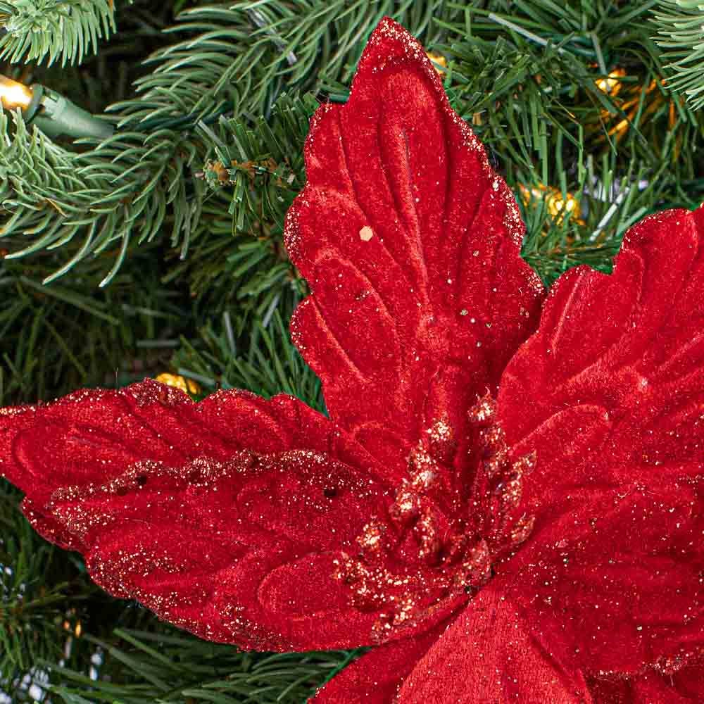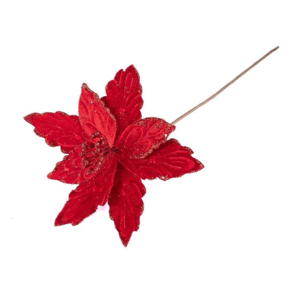 The stem has an embossed poinsettia bloom with glittered edges, color matching stamens; perfect for when you want to make a statement in your holiday decor. Use in seasonal floral arrangements, Christmas wreaths, Christmas trees, and other winter displays.