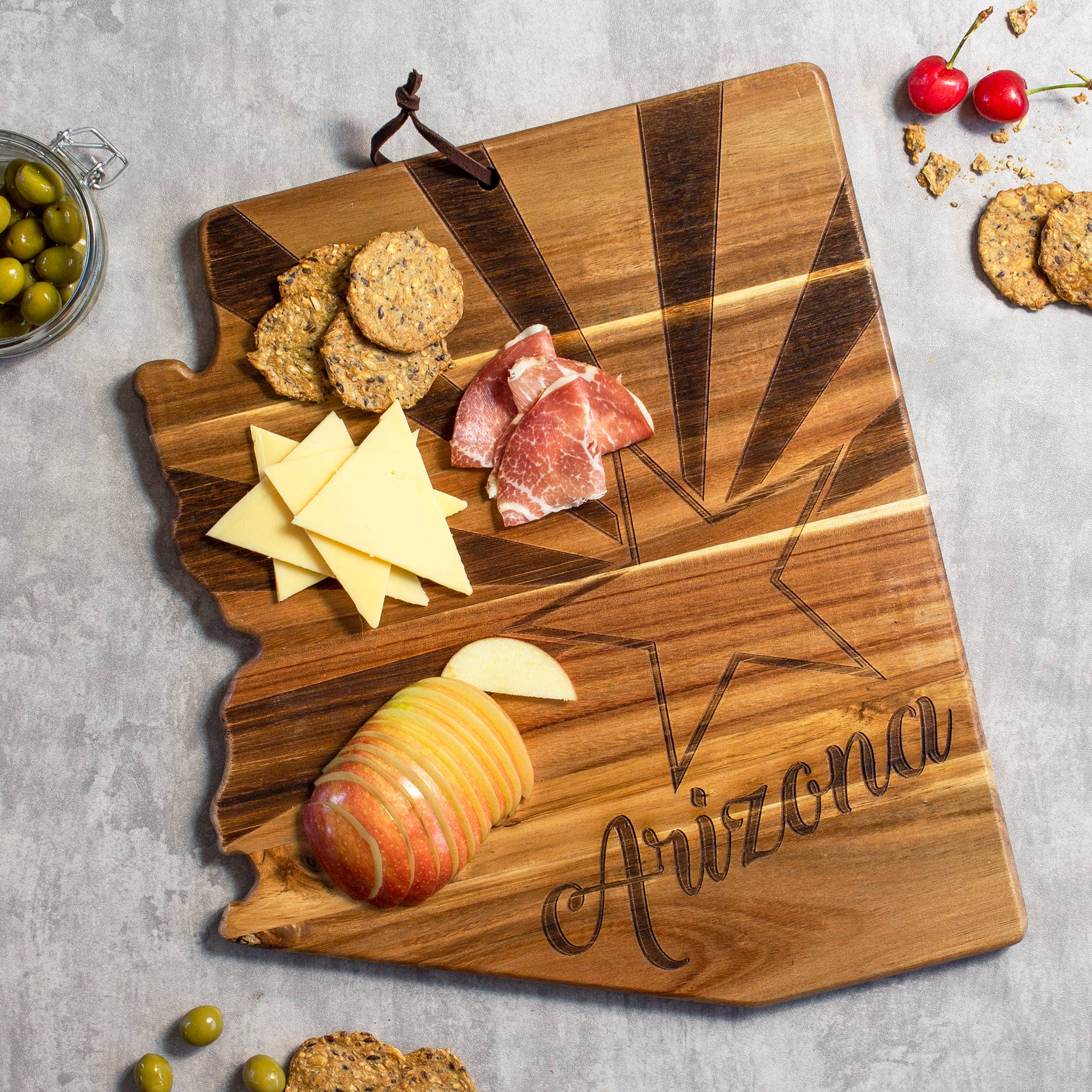 Our Arizona State Wood Cutting/Charcuterie Board is laser-engraved crafted from acacia wood for a beautiful look that's unique to each individual board. The Origins boards offer a stylish way  to add some "local flavor" to their charcuterie spreads. They also double wonderfully as wall décor with the included hang tie. For use as a cutting board, we recommend flipping the board over to the blank side.