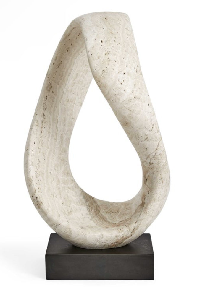 An endless twisted loop of light beige unfilled honed travertine sits atop a bronzed metal base. Each angle provides a different perspective, creating interest and intrigue.