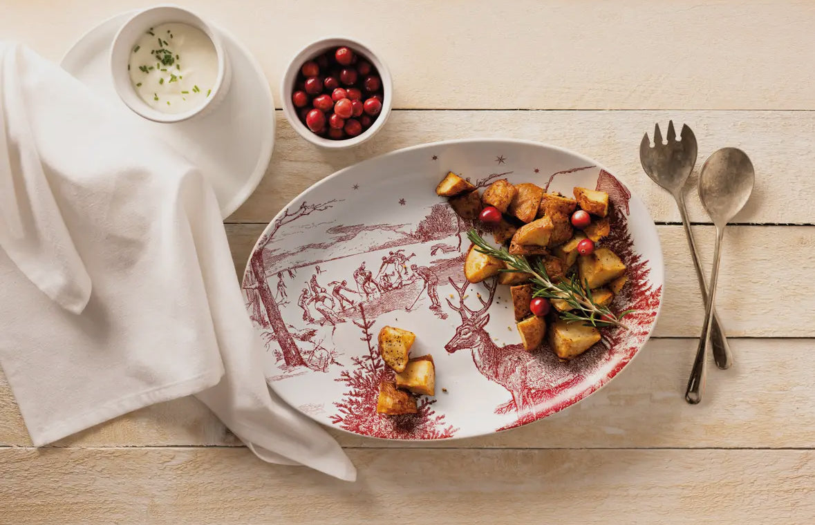 Invite nostalgia of years gone-by to the table with the traditional scene found on this Winter Toile Serving Platter. Crafted from durable stoneware, this festive platter gives your kitchen or dining room table setting a signature touch. The generous oval shape is ideal for serving guests at family dinners and holiday gatherings, and since the platter is microwave and oven-safe up, your homemade dishes can be warmed up with ease.