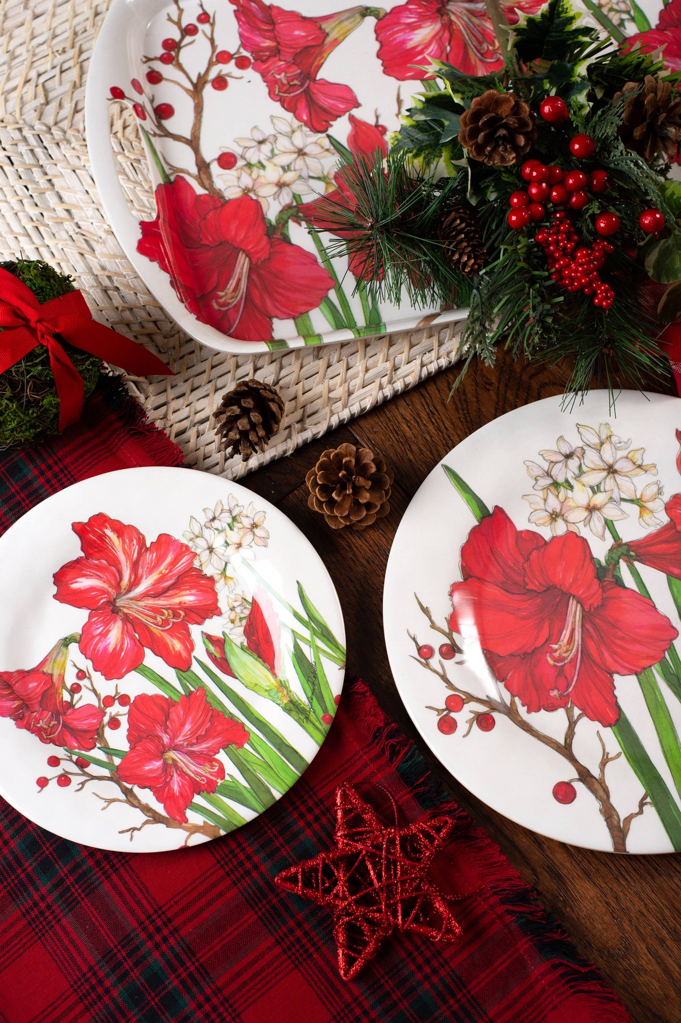 Amaryllis Christmas Holiday Bamboo Dinner Plates are easy to care for & elegant made of bamboo. Each eco-friendly & lightweight round plate. Bamboo Table combines the look and feel of upscale dinnerware, all while keeping the Earth & ocean in mind.
