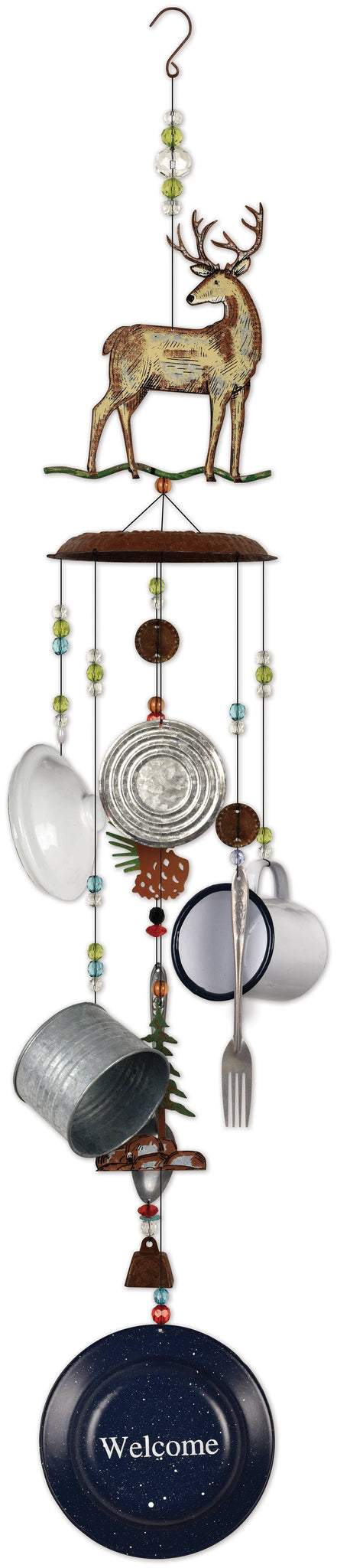 "Welcome to the Woods", proclaimed the Stag – so don’t pass the Buck on this woodsy greeting for your guests. This cutlery chime features vintage enamel dishes, tin can, and laser cut metal forest icons that dance in the breeze to create a pleasing sound; features colorful beaded accents. Adds the perfect touch to your campsite, cabin or Man Cave! Please Note* This item is crafted with metal and is designed to rust over time, enhancing the “Rustic Charm” style Handcrafted with galvanized metal, enameled metal, nylon & acrylic. 6.25" dinner plate reads "Welcome". Easy hang hook included. Perfect gift for hunters or nature lovers! Ideal for hanging near driveway entrance. Measures approximately: 6.25" x 6" x 36"
