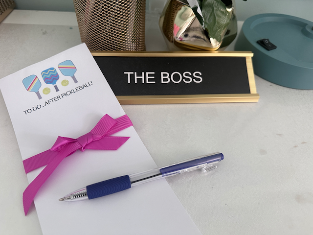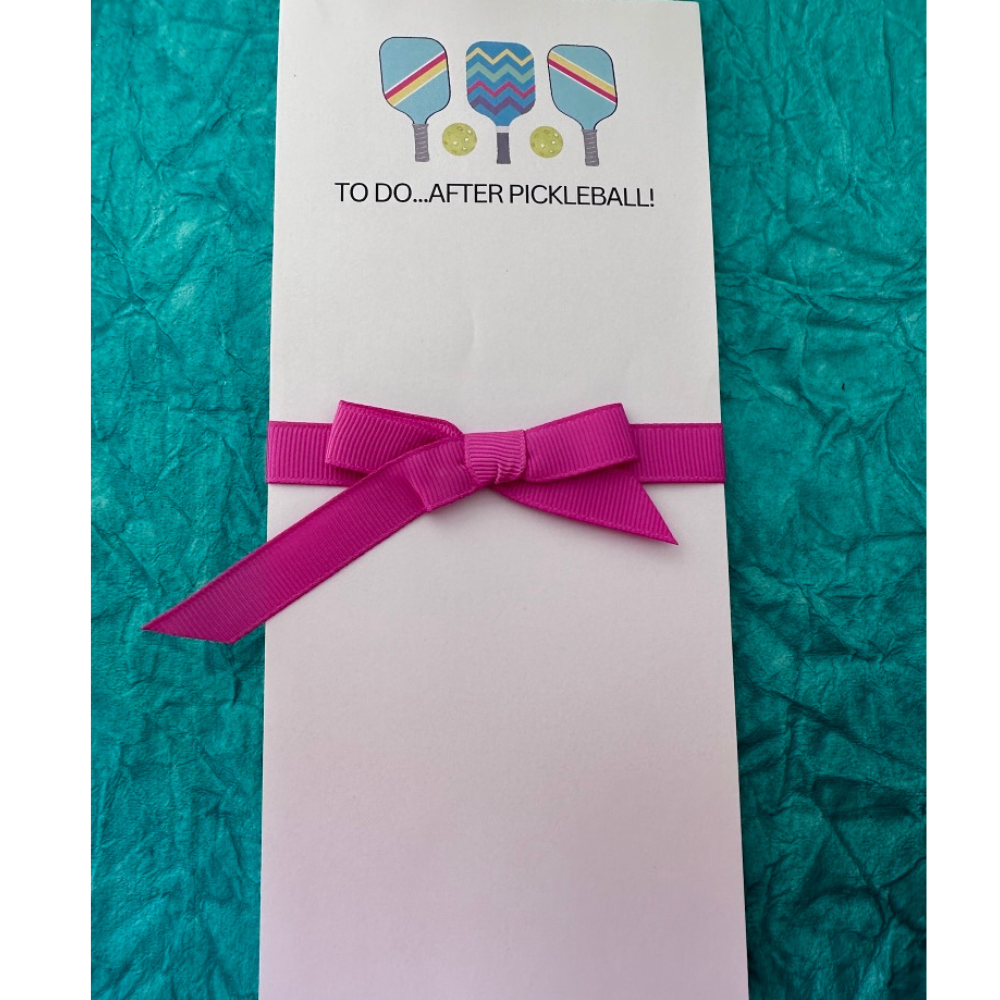 Designed specifically with pickleball players in mind, this notepad is the perfect companion to jot down game strategies, track improvements, or list your post-game reflections and to-dos. Measuring 3.5” x 8.5” with 50 sheets, each notepad is adorned with a coordinating ribbon, symbolizing the blend of functionality and style inherent to the sport of pickleball. This attention to detail makes it an ideal gift for the pickleball player in your life. This notepad serves as a thoughtful and practical present for any pickleball player, offering them a unique way to enhance their game and organize their life.